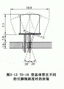 印制線路板的裝配角度來看,需要考慮一個重要因素就是應(yīng)該特別注意在焊接前,由于插入的元器件與其理論位置發(fā)生傾斜而可能造的短路問題。根據(jù)經(jīng)驗(yàn),元器件引腳允許的傾斜度應(yīng)保持在與理論位置成15 。角以內(nèi)。當(dāng)孔和引腳的直徑差值較大時(shí)傾斜度-可達(dá)到20°。垂直安裝的元器件,傾斜度可達(dá)到25 ?;?0° , 但這樣會導(dǎo)致封裝密度的降低。圖3-13 是TO-18 型晶體管在不同的引腳傾斜度時(shí)的封裝,圖中, TO-I8 型晶體管安裝位置距印制電路板2mm ,如果孔徑為Imm ,傾斜度可以達(dá)到20° ,當(dāng)然引腳本身沒有任何的傾斜。